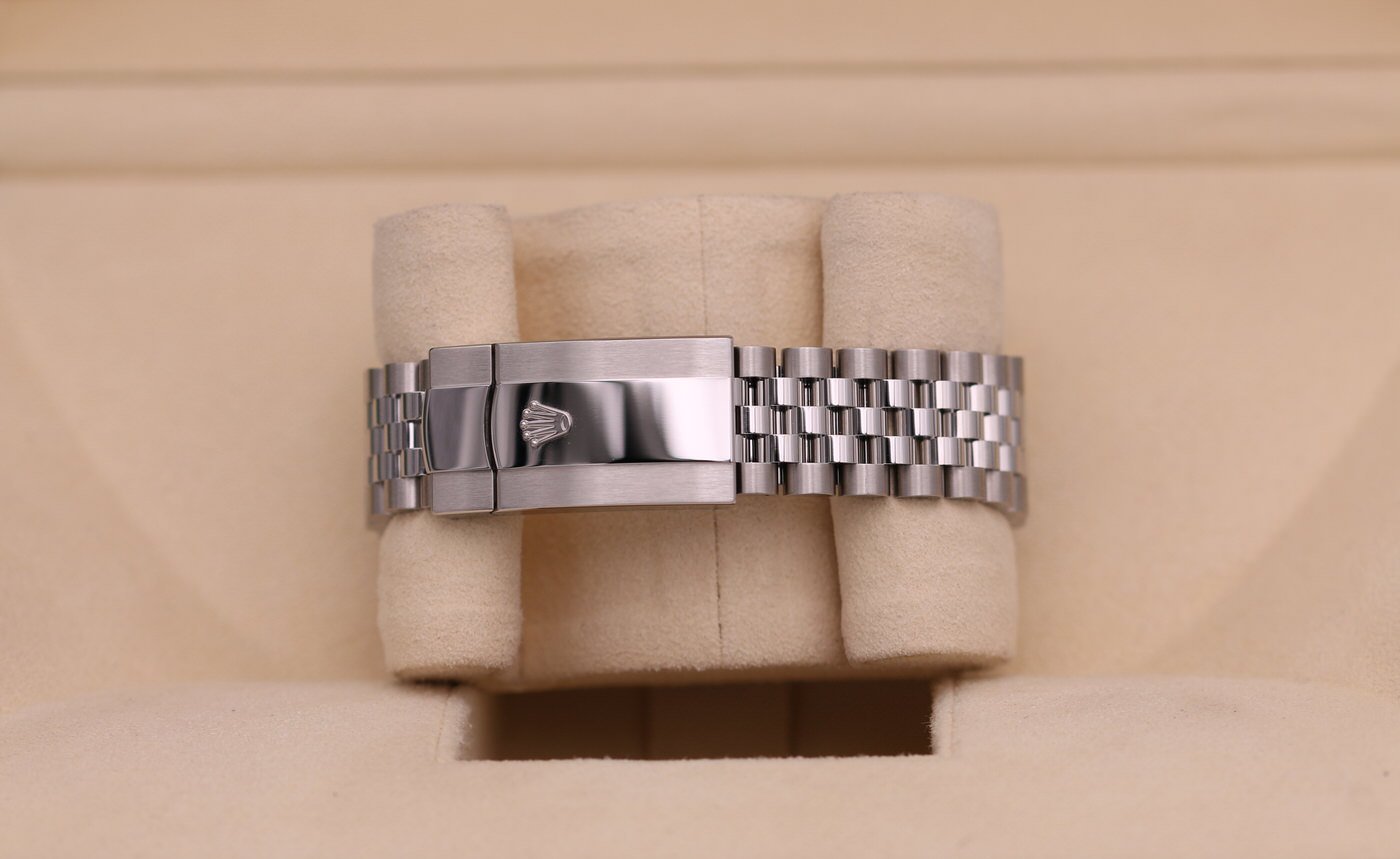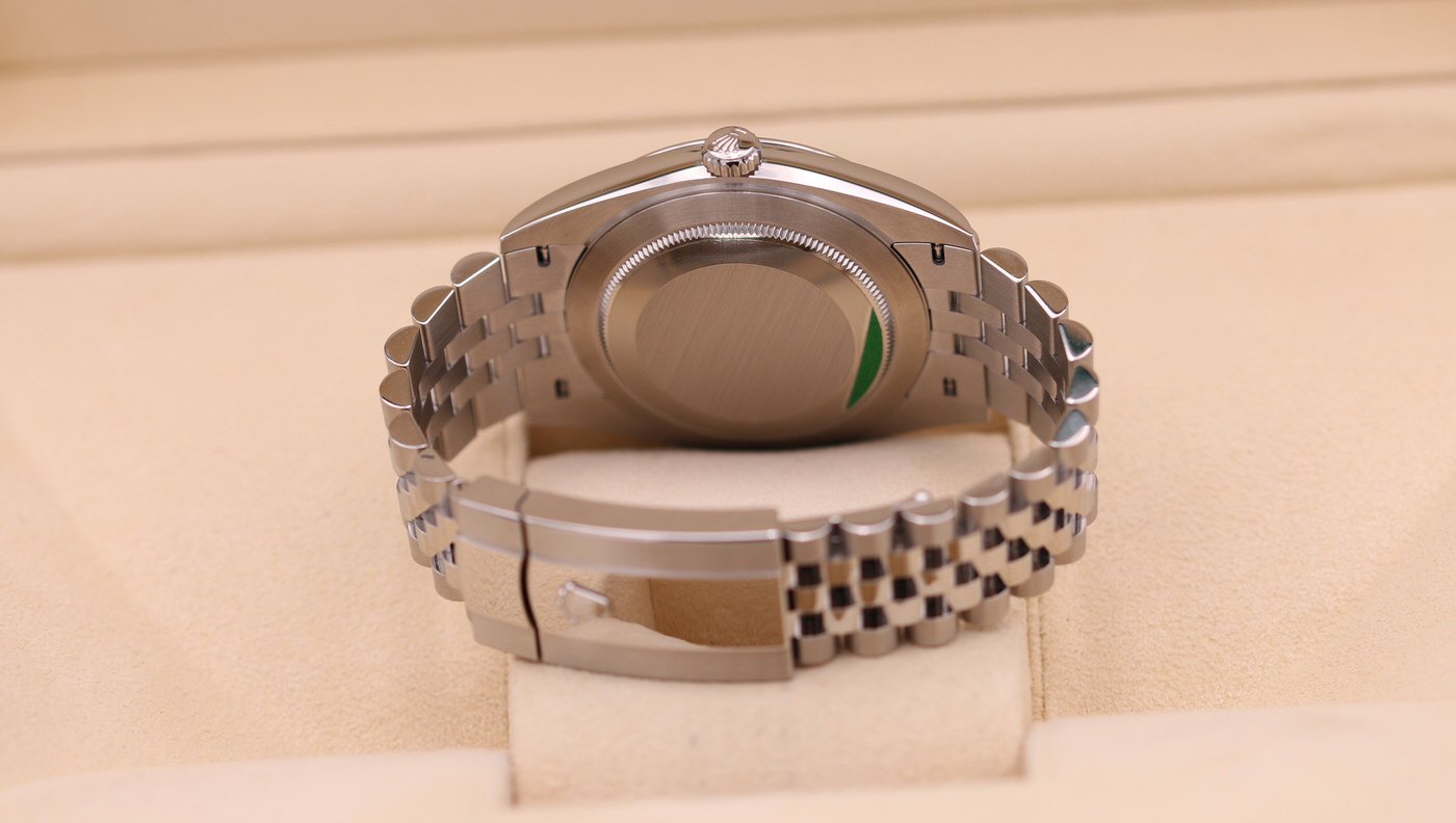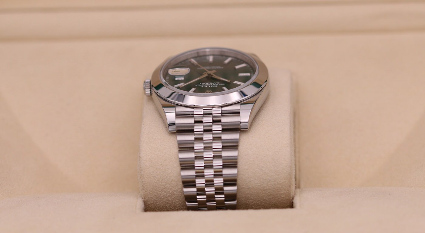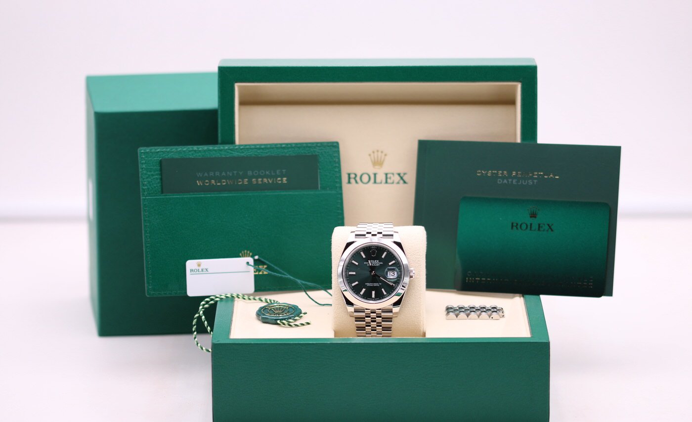 This Rolex DateJust 41 is unpolished and in excellent condition – it is like new. There are a few tiny hairlines from handling. It is the newest reference with the updated movement featuring a mint green dial on a jubilee bracelet. It comes with the boxes, booklet, warranty card, hang tags and was just sold in May of 2025.